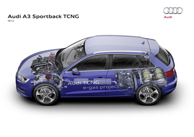 Ende nächsten Jahres plant Audi den Marktstart seines ersten ab Werk mit Erdgasantrieb ausgerüsteten Fahrzeuges. Der A3 Sportback TCNG wird von einem speziell auf Gasbetrieb entwickelten 1,4-Liter-Benzinmotor angetrieben, der es auf 81 kW/110 PS bringt und ein Drehmoment von maximal 200 Newtonmetern entwickelt. Die Spitzengeschwindigkeit soll bei über 190 km/h liegen, 100km/h sollen bereits in 9,5 Sekunden erreicht sein.