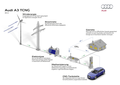 Herzstück dafür ist die erste E-Gas-Anlage die Audi von der Stuttgarter Firma Solar-Fuel im niedersächsischen Werlte errichten lässt. Hierbei wird aus Windkraft gewonnener Strom verwendet, um Wasser in Sauerstoff und Wasserstoff umzuwandeln. In einer sogenannten Methanisierungsanlage reagiert der Wasserstoff mit CO2 zu künstlichem Erdgas, das dann ins Erdgas-Netz eingespeist wird.