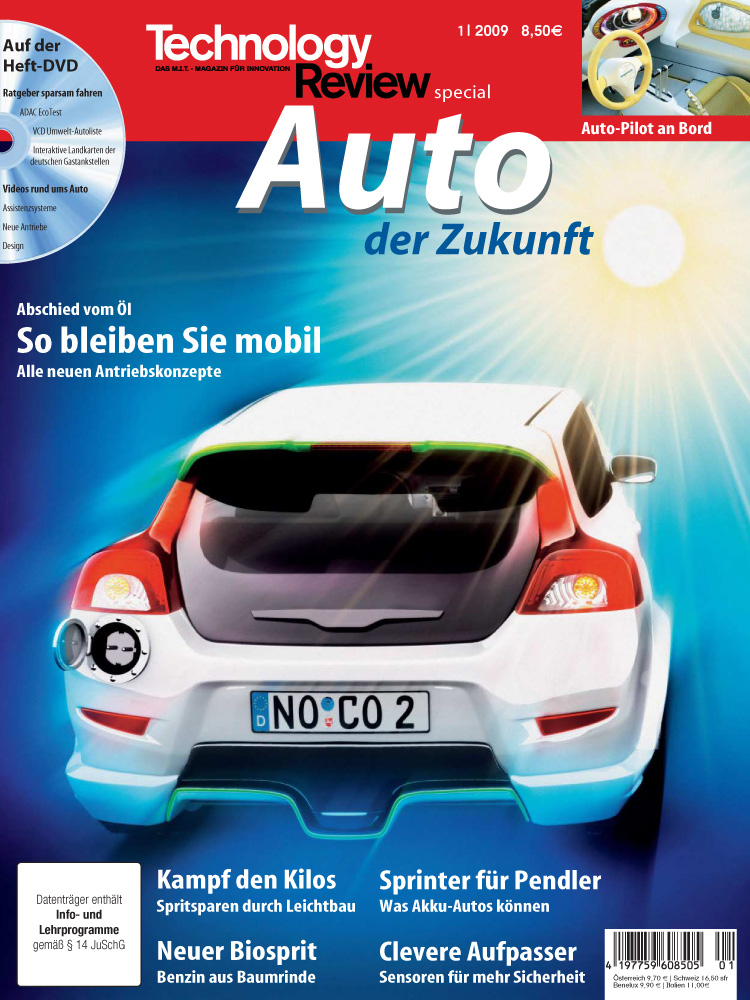 Deutschlands Autofahrer sind verunsichert. Benzin ist zwar derzeit wieder billiger, aber die Angst vor unberechenbaren Kosten bleibt. Ob man heute schon auf klimaschonende Hybrid- oder Elektroautos setzen soll, untersucht das aktuelle Sonderheft "Auto der Zukunft" vom Technologiemagazin Technology Review, das ab sofort zum Preis von 8,50 Euro mit Heft-DVD am Kiosk erhältlich ist.
