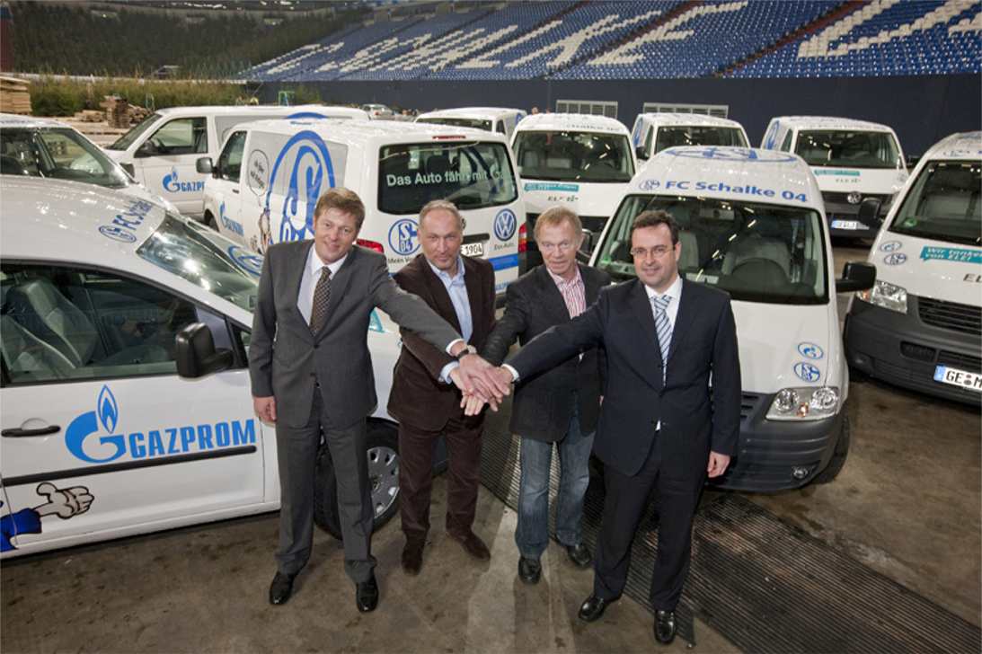 Der FC Schalke 04 rüstet um und setzt auf Nachhaltigkeit. Mit Unterstützung der Partner GAZPROM Germania, Volkswagen und der ELE erwerben die Königsblauen eine neue, erdgasbetriebene Fahrzeugflotte. Manager Andreas Müller und Bodo Menze, Leiter der Nachwuchsabteilung, nahmen zehn Volkswagen T5, drei VW Caddy und einen Touran entgegen. "Als für uns die Umstellung des Fuhrparks anstand, lag es auf der Hand, dass wir uns mit gasbetriebenen Fahrzeugen beschäftigen", erklärte Andreas Müller. "Einerseits wegen der Alternative zum Benzinantrieb, vor allem aber auch, weil wir mit Gazprom den weltweit größten Erdgaslieferanten als Hauptsponsor haben. Der Umstieg hat für uns nur Vorteile. Wir können bei diesem Projekt auf der eine Seite sparen und auf der anderen Seite etwas für die Umwelt tun", so Andreas Müller.