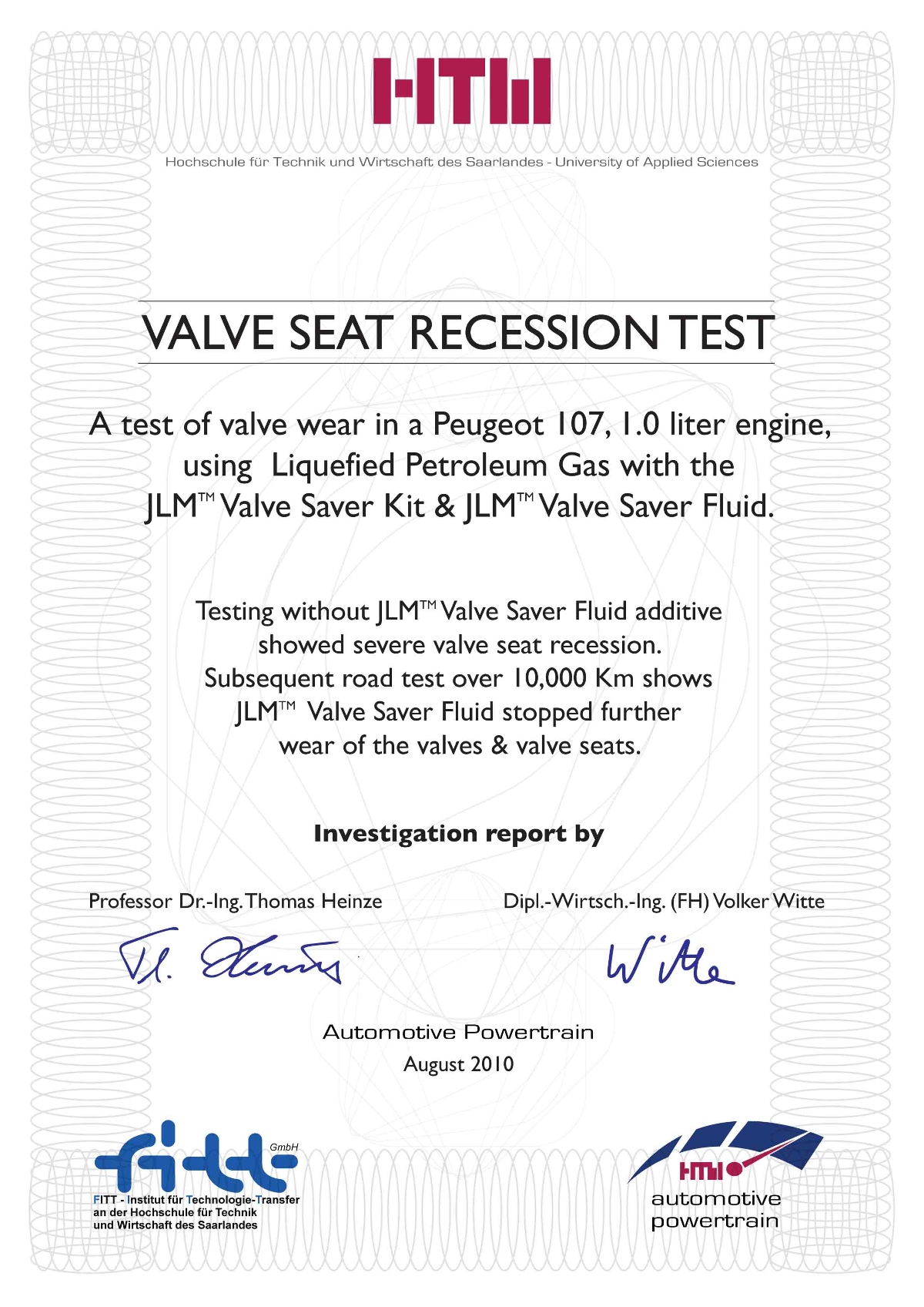 JLM Valve Saver Fluid wurde durch die Hochschule für Technik und Wirtschaft des Saarlandes (HTW) in Saarbrücken getetstet. Der Test erfolgte mit einem Peugeot 107 1.0 der auf Autogas nachgerüstet wurde. An dem Motor, der in der Branche als besonders anfällig für Gasbetrieb gilt, zeigte sich nach einem 10.000 km Dauertest keinerlei Verschleiß an den Ventilen bzw. Ventilsitzen. Die Wissenschaftler der HTW um Professor Dr.-Ing. Thomas Heinze zeigten sich von diesem Test beeindruckt und bescheinigten dem neuen Additiv eine überaus hohe Schutzwirkung.