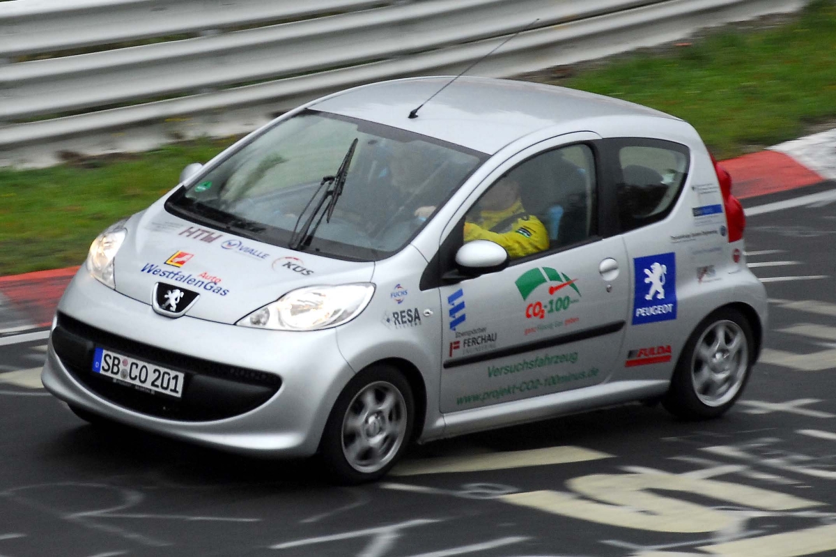 Innerhalb weniger Stunden ist der Rennfahrer Christian Hohenadel zum Autogas-Fan geworden. Für das Projekt CO2-100minus pilotierte der 33-jährige Saarländer eines der drei Versuchsfahrzeuge - einen Peugeot 107 - über die Nordschleife des Nürburgrings.
